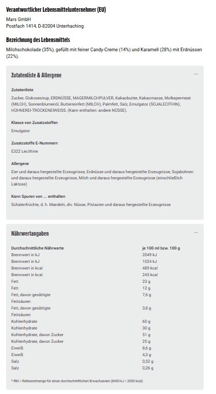 Zucker, Glukosesirup, ERDNÜSSE, MAGERMILCHPULVER, Kakaobutter, Kakaomasse, Molkepermeat (MILCH), Sonnenblumenöl, Butterreinfett (MILCH), Palmfett, Salz, Emulgator (SOJALECITHIN), HÜHNEREI-TROCKENEIWEISS. (Kann enthalten: andere NÜSSE).