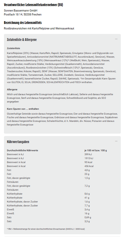 Kartoffelpüree (35%) (Wasser, Kartoffeln, Rapsöl, Speisesalz, Emulgator (Mono- und Diglyceride von Speisefettsäuren), Antioxidationsmittel (NATRIUMMETABISULFIT, Ascorbinsäure), Gewürze), Wasser, Weinsauerkrautzubereitung (18%) (Weinsauerkraut (12%)* (Weißkohl, Wein, Speisesalz), Wasser, Rapsöl, Zucker, modifizierte Stärke, Verdickungsmittel (Guarkernmehl), Antioxidationsmittel (Ascorbinsäure)), Rostbratwürstchen (15%) (Schweinefleisch (13%)*, Speisesalz, Gewürze, Traubenzucker, Kräuter, Rapsöl), SENF (Wasser, SENFSAATEN, Branntweinessig, Speisesalz, Gewürze), modifizierte Stärke, Tomatenmark, Zucker, SELLERIE, Zwiebeln, Gewürze, Verdickungsmittel (Guarkernmehl), karamellisierter Zucker, Rapsöl, SAHNE, Speisesalz. *im Gesamtprodukt Kann Spuren von GLUTEN, EI, SOJA, ERDNÜSSEN, SCHALENFRÜCHTEN und FISCH enthalten.