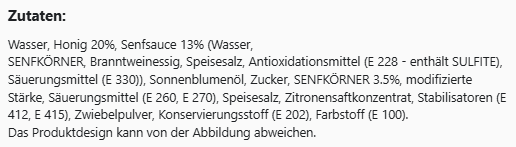 Wasser, Honig 20%, Senfsauce 13% (Wasser,SENFKÖRNER, Branntweinessig, Speisesalz, Antioxidationsmittel (E 228 - enthält SULFITE), Säuerungsmittel (E 330)), Sonnenblumenöl, Zucker, SENFKÖRNER 3.5%, modifizierte Stärke, Säuerungsmittel (E 260, E 270), Speisesalz, Zitronensaftkonzentrat, Stabilisatoren (E 412, E 415), Zwiebelpulver, Konservierungsstoff (E 202), Farbstoff (E 100).