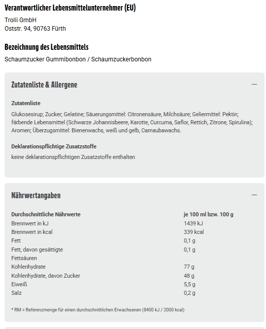 Glukosesirup; Zucker; Gelatine; Säuerungsmittel: Citronensäure, Milchsäure; Geliermittel: Pektin; färbende Lebensmittel (Schwarze Johannisbeere, Karotte, Curcuma, Saflor, Rettich, Zitrone, Spirulina); Aromen; Überzugsmittel: Bienenwachs, weiß und gelb, Carnaubawachs.