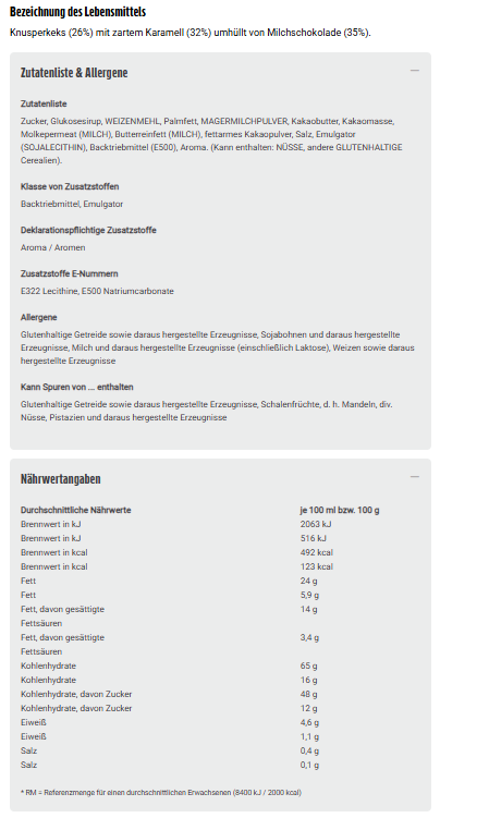 Knusperkeks (26%) mit zartem Karamell (32%) umhüllt von Milchschokolade (35%).