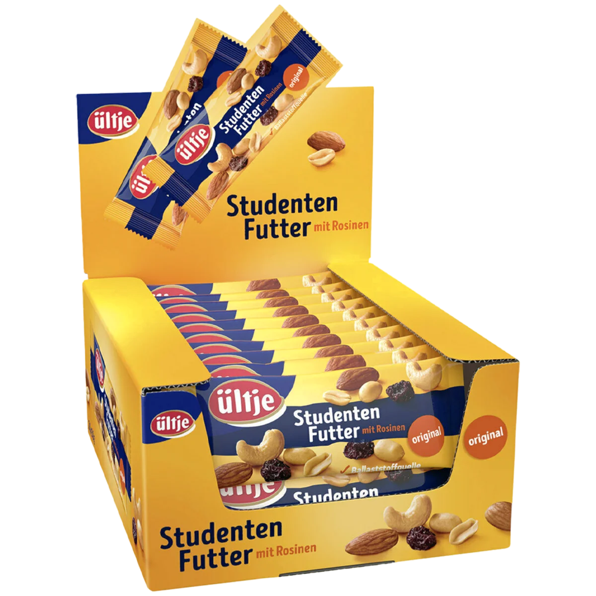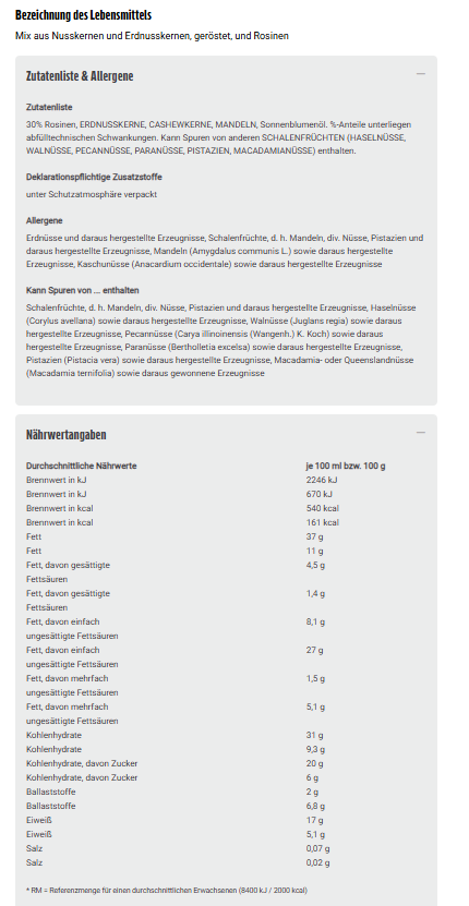 Zutaten: 30% Rosinen, ERDNUSSKERNE, CASHEWKERNE, MANDELN, Sonnenblumenöl. %-Anteile unterliegen abfülltechnischen Schwankungen. Kann Spuren von anderen SCHALENFRÜCHTEN (HASELNÜSSE, WALNÜSSE, PECANNÜSSE, PARANÜSSE, PISTAZIEN, MACADAMIANÜSSE) enthalten.