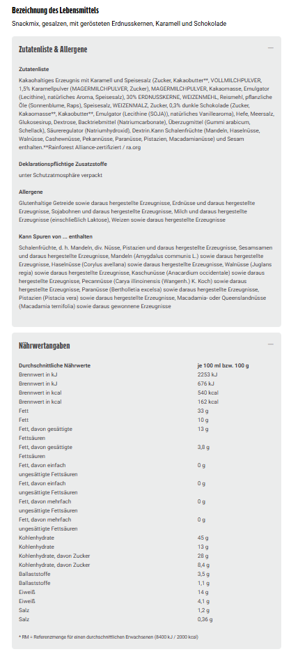 Kakaohaltiges Erzeugnis mit Karamell und Speisesalz (Zucker, Kakaobutter**, VOLLMILCHPULVER, 1,5% Karamellpulver (MAGERMILCHPULVER, Zucker), MAGERMILCHPULVER, Kakaomasse, Emulgator (Lecithine), natürliches Aroma, Speisesalz), 30% ERDNUSSKERNE, WEIZENMEHL, Reismehl, pflanzliche Öle (Sonnenblume, Raps), Speisesalz, WEIZENMALZ, Zucker, 0,3% dunkle Schokolade (Zucker, Kakaomasse**, Kakaobutter**, Emulgator (Lecithine (SOJA)), natürliches Vanillearoma), Hefe, Meersalz, Glukosesirup, Dextrose, Backtriebmittel (Natriumcarbonate), Überzugmittel (Gummi arabicum, Schellack), Säureregulator (Natriumhydroxid), Dextrin.Kann Schalenfrüchte (Mandeln, Haselnüsse, Walnüsse, Cashewnüsse, Pekannüsse, Paranüsse, Pistazien, Macadamianüsse) und Sesam enthalten.**Rainforest Alliance-zertifiziert / ra.org