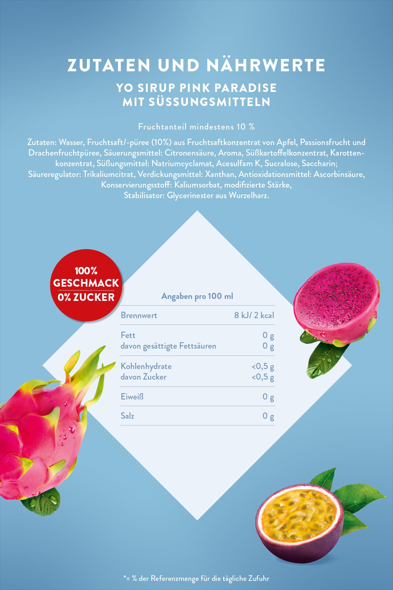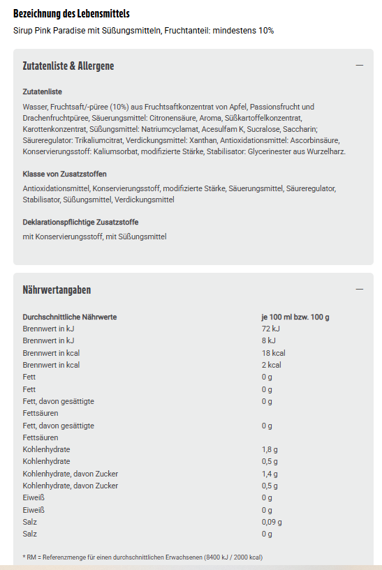 Wasser, Fruchtsaft/-püree (10%) aus Fruchtsaftkonzentrat von Apfel, Passionsfrucht und Drachenfruchtpüree, Säuerungsmittel: Citronensäure, Aroma, Süßkartoffelkonzentrat, Karottenkonzentrat, Süßungsmittel: Natriumcyclamat, Acesulfam K, Sucralose, Saccharin; Säureregulator: Trikaliumcitrat, Verdickungsmittel: Xanthan, Antioxidationsmittel: Ascorbinsäure, Konservierungsstoff: Kaliumsorbat, modifizierte Stärke, Stabilisator: Glycerinester aus Wurzelharz.